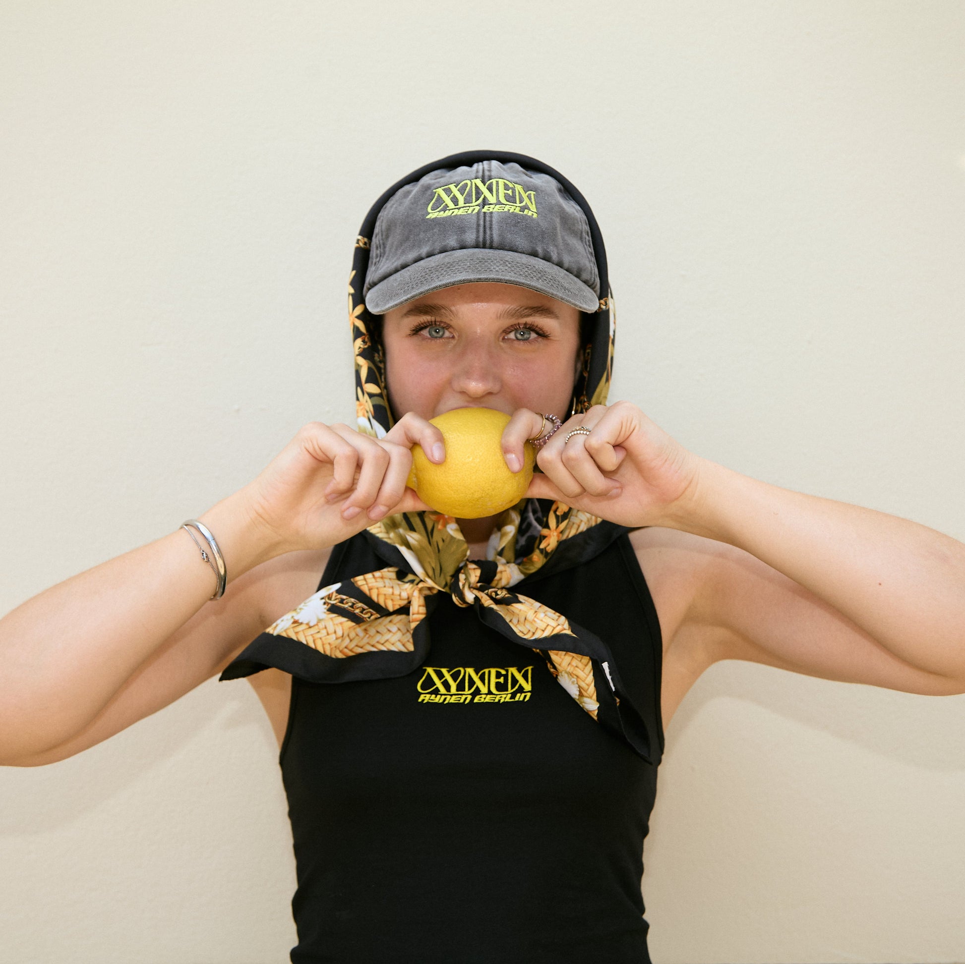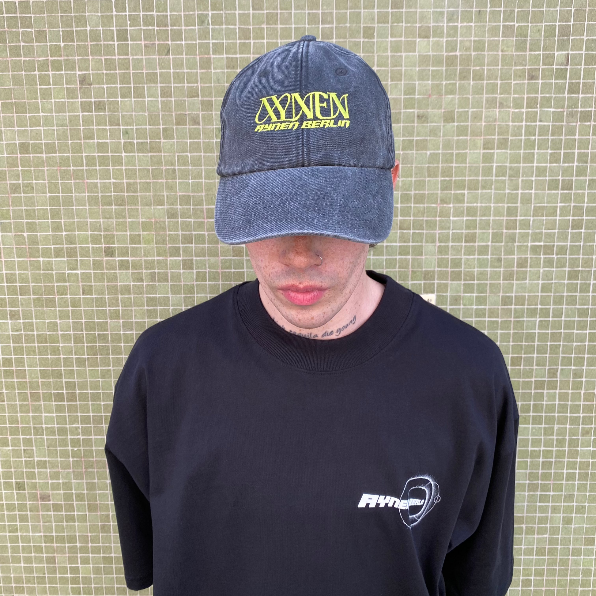 The design appears in neon yellow on a washed black vintage cap, embroidered climate-neutrally in Berlin.